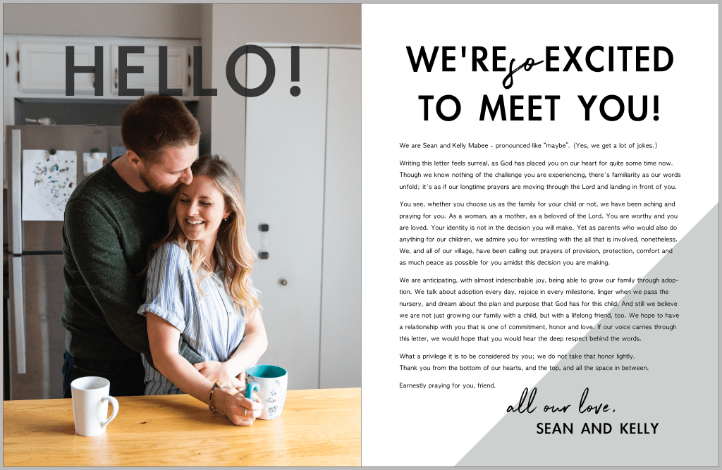 Here you are. This may be one of the hardest, most-significant things you do in your adoption process — just shy of your initial yes and the day you actually bring your little one home. Even still, it is my prayer for you that the significance of these words you’re about to write encourages you more than it overwhelms you. This truly is your chance to be Jesus – to speak life louder than shame, to honor the bravery of this woman, to acknowledge her sacrifice in choosing life, and introduce yourselves to her. My best advice: Trust yourself! Don’t try to be someone you’re not. Who you are and what you have to give is enough. Imagine this woman is sitting across from you, as uncomfortable as it might be, what do you wish you could tell her – whether she chooses you or not. Look back at the samples and read as many examples as you need to, but eventually you’ll just have to do it. Be bold and courageous, friend, and ask Holy Spirit to help you.