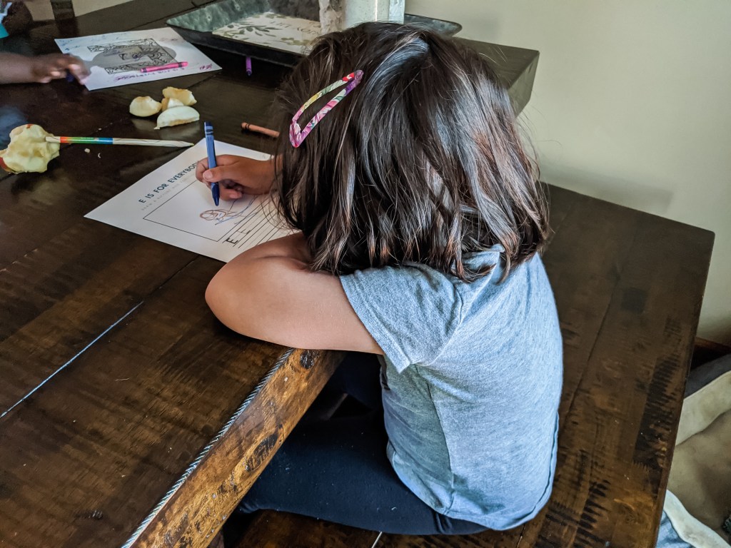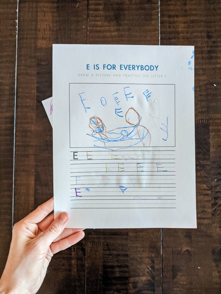 I snuck in some learning and introduced the Letter E next. We colored the E coloring page, drew a picture of what “everybody” looked like, and practiced writing the letter on the lines.