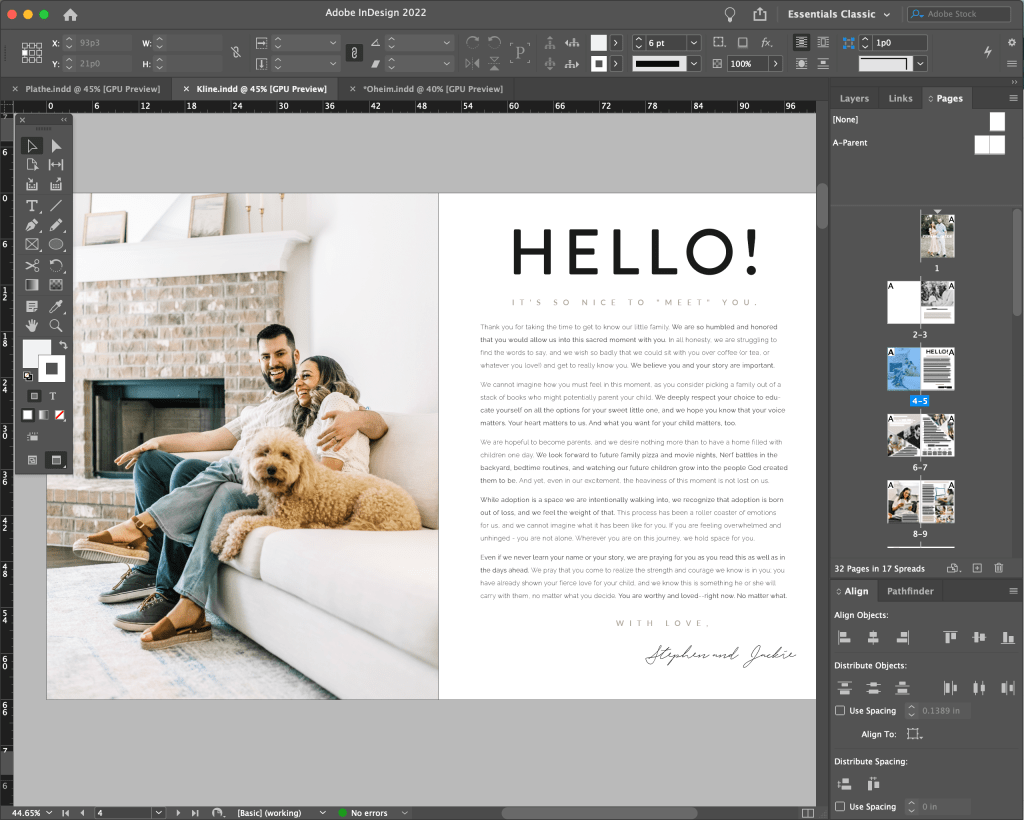 My designs use a lot of large, interactive photos that aim to tell a story. While I do utilize lists and bullet points throughout, a majority of my written material is in story form. I really believe this invites a mama in and allows her to see an authentic picture of YOU! Many expectant/birth moms have expressed that this style of writing of my profiles leave them feeling “talked to instead of talked at”. In addition, I also use a lot of light colors, clean texts, and white space!